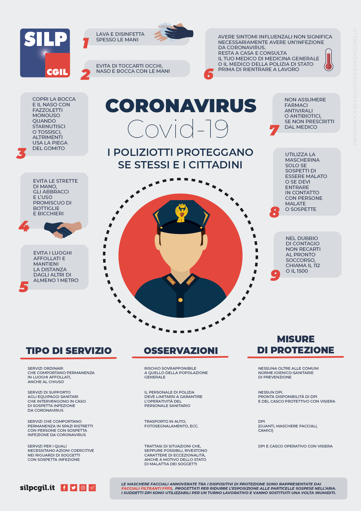 I suggerimenti principali del Ministero della Salute e della Direzione Centrale di Sanità raccolti in una infografica di facile lettura, a cura della Segreteria Nazionale Silp Cgil, da leggere e condividere.