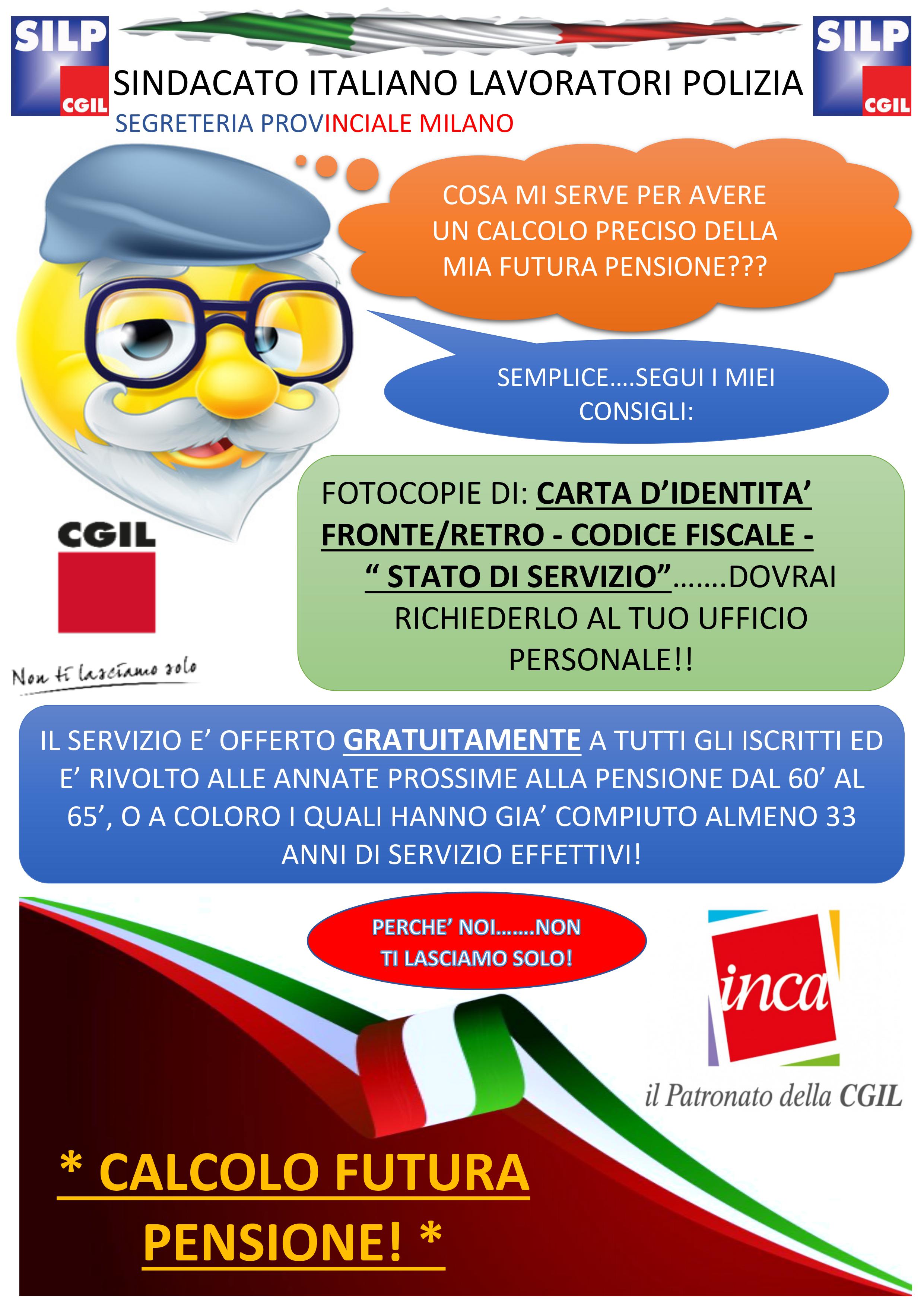 In collaborazione con il Patronato Inca CGIL di Milano, offriamo a tutti i nostri iscritti interessati, il servizio di consulenza previdenziale sia per il calcolo del diritto a pensione che per l'importo presunto della stessa.